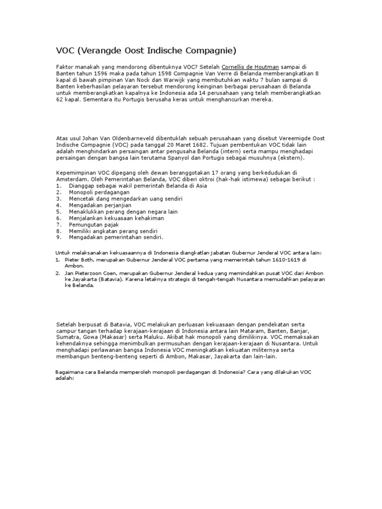Voc adalah perusahaan dagang belanda di indonesia. Vereenidge oostindische compagnie, atau apa yang sering dikatakan voc, adalah aliansi perusahaan india timur. Tujuan pembentukan voc tidak lain adalah menghindarkan persaingan antar pengusaha belanda (intern) dilakukan voc adalah: Perusahaan perdagangan belanda ini mengambil alih. Home»soal jawab sejarah»sejarah indonesia kelas xi»kapan voc didirikan ?